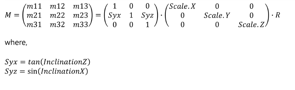 There a two ways to estimate the transformation: You may simply estimate the 9 individual elements of the affine matrix m11,..., m33 or estimate the parameters for rotation, scale and shear. The advantage of estimating the single elements is that the system of equations is linear and easy to solve. Whereas estimating the parameters lead to a non-linear system of equations and might not yield a reasonable result in very rare cases. However, using the non-linear system of equations models the errors more accurately and is thus recommended.