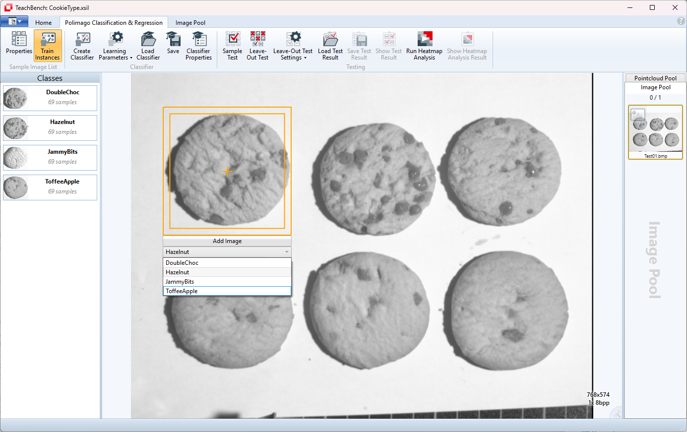 Training of such a Polimago regression-classifier is done within the TeachBench as a Polimago Classification and Regression Project. The following screenshot shows the training set and a test image for classifing the cookie type.