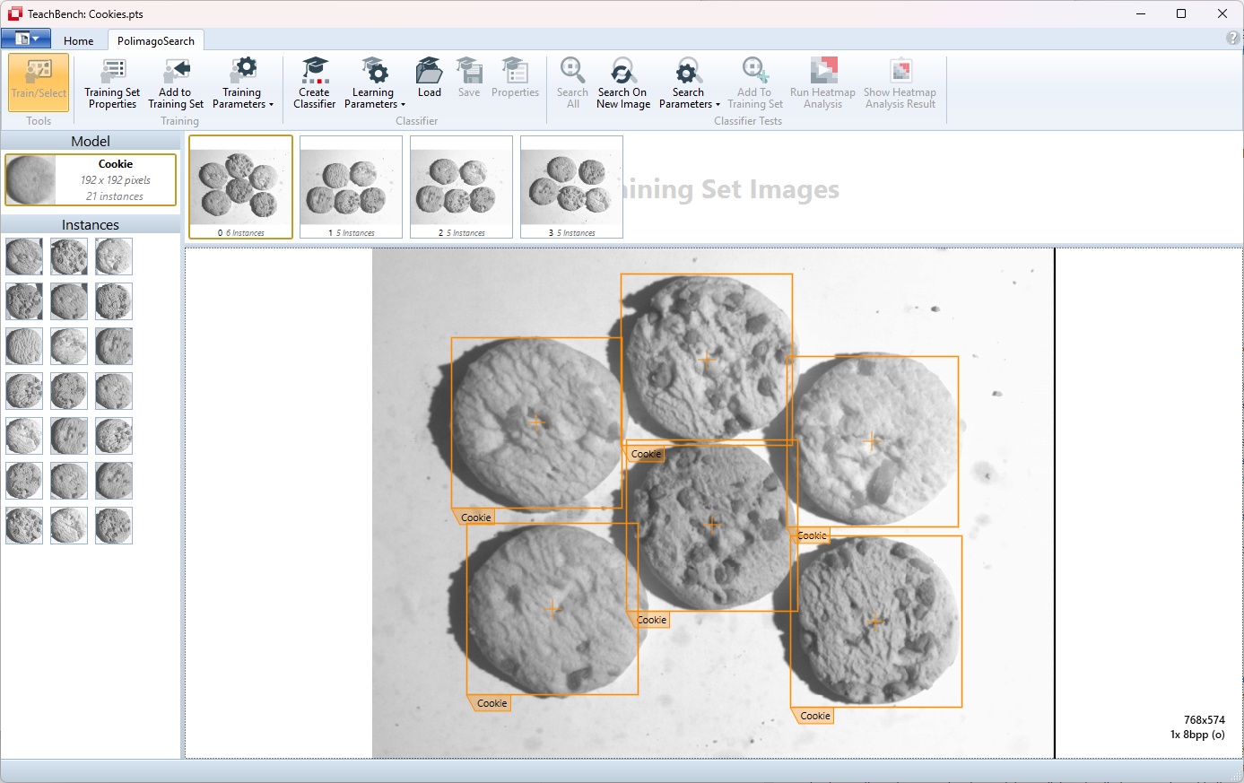 Training of such a Polimago search-classifier is done within the TeachBench as a Polimago Search Project. The following screenshot demonstrates the training set for detecting different kinds of cookies in an image.