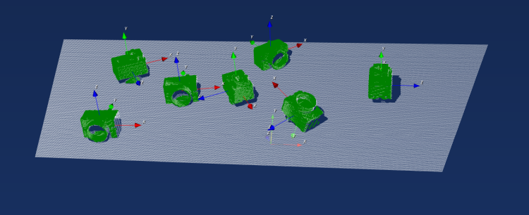 The result of the object detection is a list of hits, each indicating the location and orientation of the object within the point cloud. If the sensor generating the point cloud is calibrated with a robot, the hit data can be transferred to the robot in order to grip the objects.