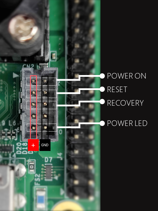 Use the CN2 connector for board control. The pins of CN2 are connecting the power on trigger, the reset trigger, the recovery mode trigger and a status led output. See the following pin order for the correct setup.