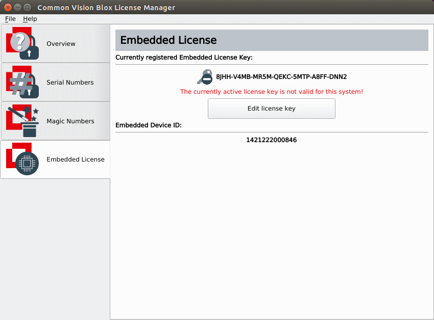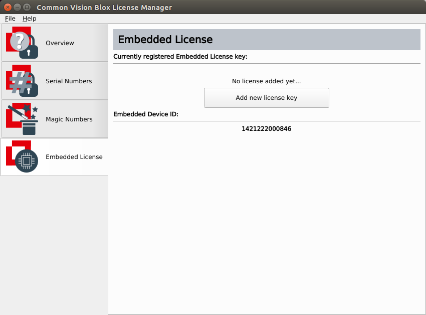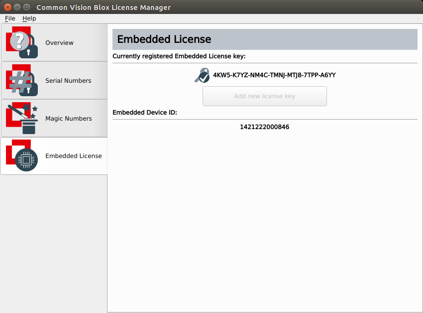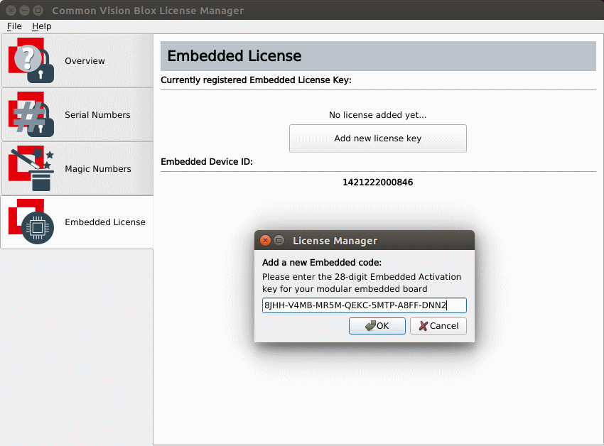 In both cases, locate the 7x4 character alphanumeric activation key that came with the device, open the Common Vision Blox License Manager. Note, that you have to start the License Manager as administrator with sudo. Then head to the "Embedded License" tab and click the "Add new license key" button and enter the key: