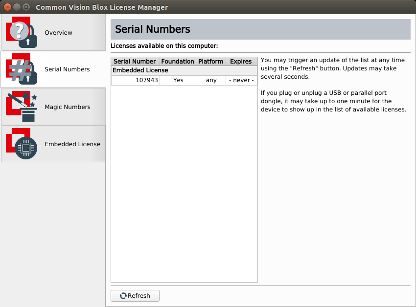 If an Image Manager Embedded License is available on your system, the Serial Numbers tab of the License Manager will show a corresponding Common Vision Blox Serial number in the range [100,000 ... 199,999]: